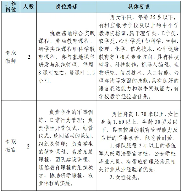 根据《事业单位人事管理条例》(国务院令第652号)、《事业单位公开招聘违纪违规行为处理规定》(人社部令第35号)、《湖南省事业单位公开招聘人员办法》(湘人社发〔2019〕1号)的有关精神,为落实人才兴教战略,全面打造基地劳动教育、科学教育和综合实践活动特色,增加基地科技型、信息型教师力量,基地决定面向社会公开招聘编外合同制中小学教师2名、教官2名。现将有关事项通告如下: