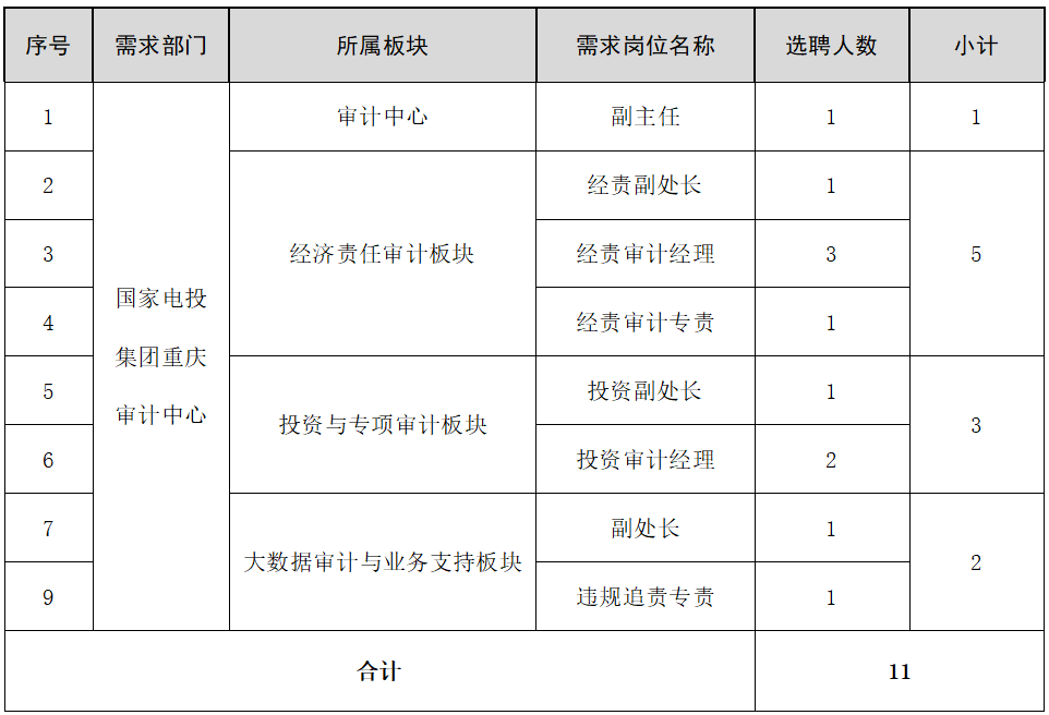根据工作需要,现面向系统内公开选聘国家电投集团重庆审计中心8个岗位、共计11人,具体事项公告如下: