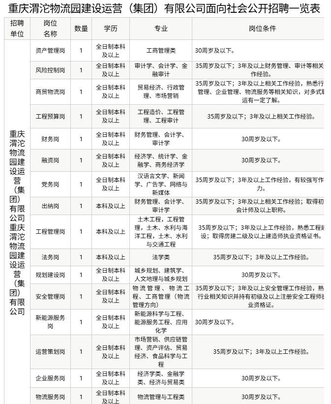 重庆渭沱物流园建设运营(集团)有限公司(曾用名:重庆市合川物铁开发投资有限公司)是2015年1月经合川区人民政府批准设立的国有企业,主要负责物流园片区开发建设及运营服务。为广泛吸纳优秀人才,加强公司人才队伍建设,经合川区人民政府批准,重庆渭沱物流园建设运营(集团)有限公司(以下简称区物流(集团)公司)现面向社会公开招聘16名工作人员。