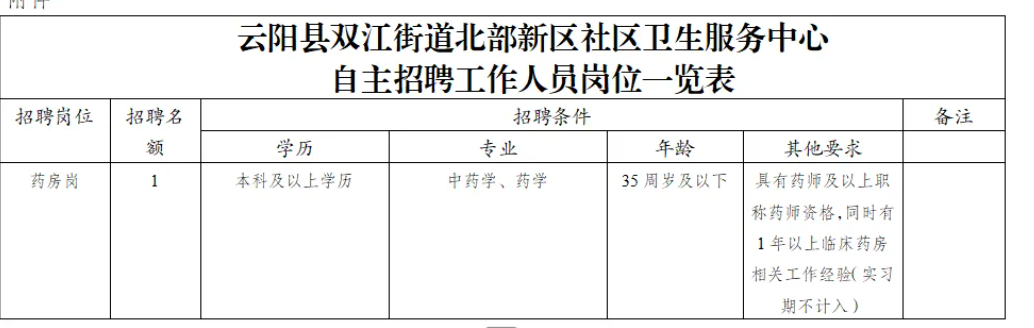 本次共招聘1名工作人员,招聘条件详见《云阳县双江街道北部新区社区卫生服务中心自主招聘工作人员岗位一览表》(附件,以下简称《岗位一览表》)