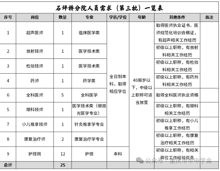 石坪桥分院人员需求(第三批)一览表