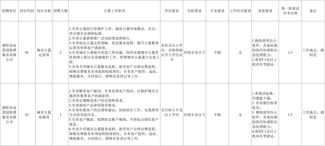报名、照片上传时间:自简章公告发布之日起至11月6日12:00。报名网址:登录“迁宿迁直聘网”官网(https://www.qsqjob.com),点击首页“泗阳县追思园殡葬服务有限公司2025年招聘劳务派遣人员报名入口”。