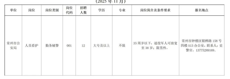 详见《常州市公安局招聘警务辅助人员岗位及岗位条件简介表》(附件1)。
