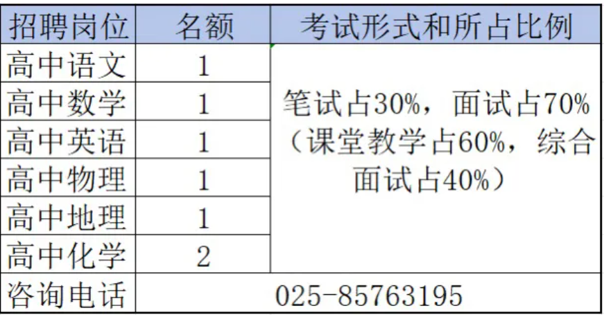 1.笔试笔试定于2025年12月13日下午举行,应聘人员应携带准考证和身份证,按照规定的时间到考点参加笔试,具体时间、地点详见准考证。笔试内容为学科专业知识(总分为100分)。笔试成绩将于2025年12月17日在南京市教育局网站公布,应聘人员可凭本人有效居民身份证和准考证号查询。本次考试不指定考试大纲和参考用书,不举办也不授权或委托任何单位举办任何形式的培训班。