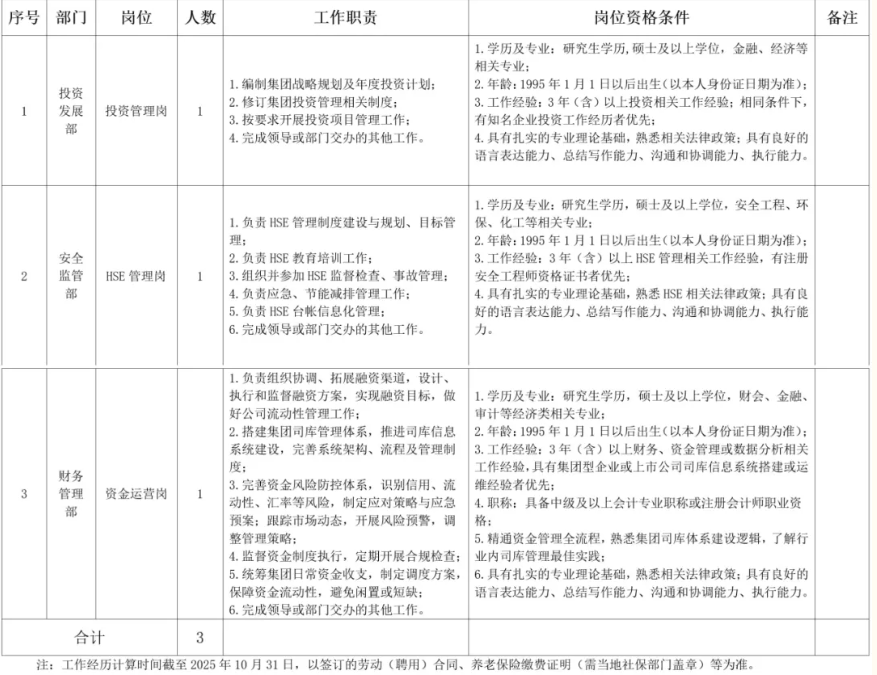 2.安全监管部(HSE管理岗):1人;