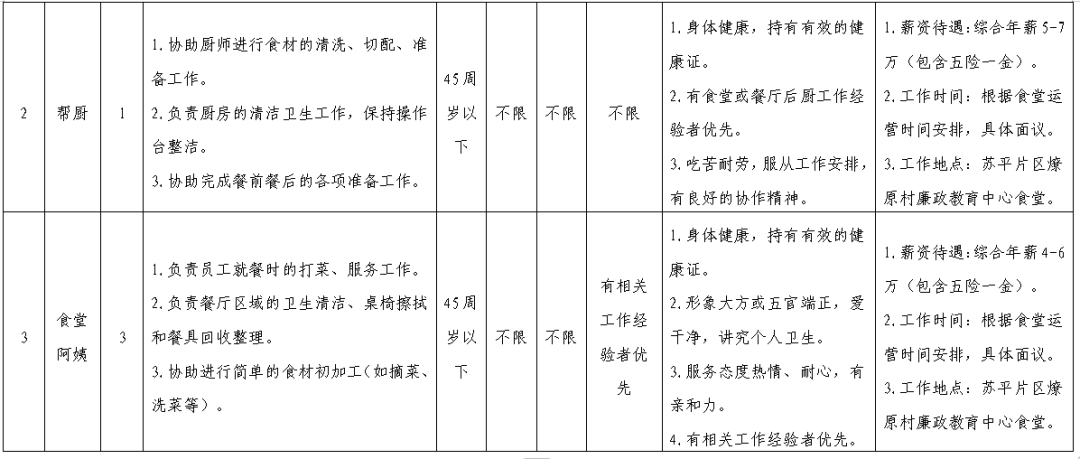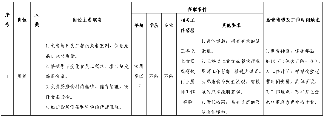 因公司业务扩展需要,我司决定面向社会招聘5名工作人员,分别为1名厨师、1名帮厨和3名食堂阿姨,用工性质为劳务外包,现将有关事项公告如下: