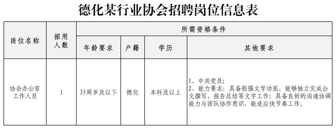 因工作需要,德化人力资本有限公司受一行业协会委托招聘工作人员1名。现将有关事项公告如下: