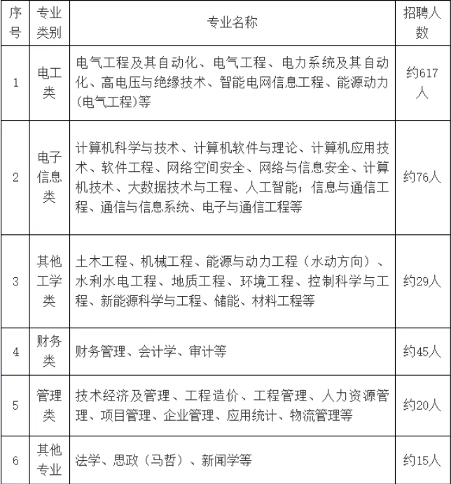 岗位包括:电网调控运行、输电运检、变电运检、城区配电、电力营销、乡镇及农村配电营业、通信运检网络安全、数据管理、水电运维及检修、送变电施工等岗位。