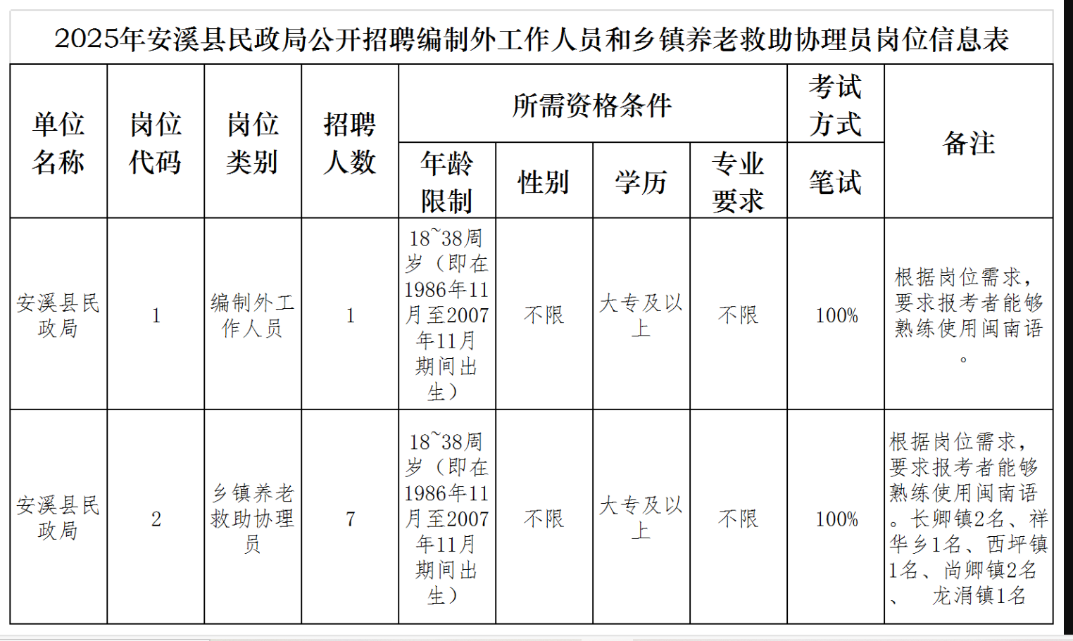 具体岗位及招聘人数详见附件:《2025年安溪县民政局公开招聘编制外工作人员和乡镇养老救助协理员岗位信息表》。