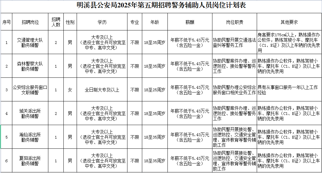 因工作需要,明溪县公安局拟招聘8名警务辅助人员(警务辅助人员是指为公安机关警务活动及相关工作提供辅助支持的非人民警察身份的编外人员,以下简称“辅警”),现将有关事项公告如下: