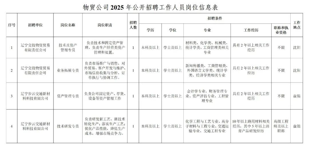 为满足业务发展需要,辽宁交投物资贸易有限责任公司及下属辽宁步云交通新材料科技有限公司拟面向社会招聘4名工作人员(具体岗位见附件1《2025年公开招聘工作人员岗位信息表》),现公告如下: