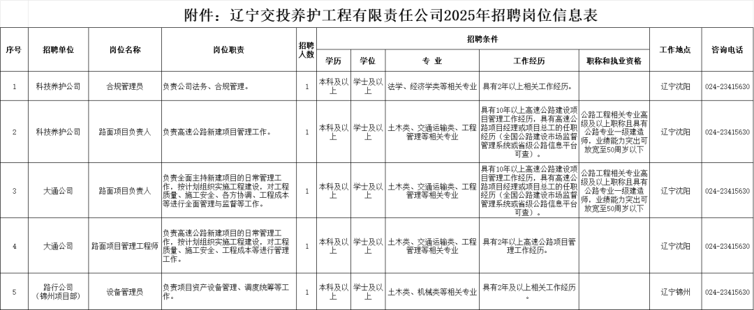 9.符合具体招聘岗位所需要的其他条件(详见《辽宁交投养护工程有限责任公司2025年招聘岗位信息表》,招聘条件要求具有相关工作经历的,年限计算的截止时间为1990年9月30日)。
