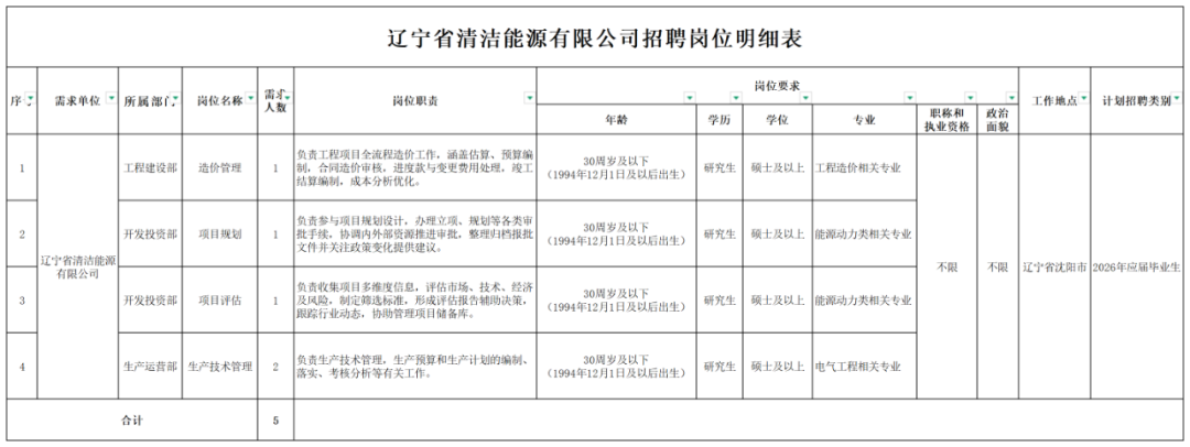 辽宁省清洁能源有限公司(以下简称“清洁能源公司”)系辽宁省能源产业控股集团有限责任公司(以下简称“能源控股集团”)控股的国有全资公司,由能源控股集团联合其所属的辽宁铁法能源有限责任公司、抚顺矿业集团有限责任公司、辽宁能源投资(集团)有限责任公司及阜新矿业(集团)有限责任公司共同出资组建,于2024年12月25日在辽宁省沈抚改革创新示范区注册成立,注册资本20亿元人民币。清洁能源公司秉持“创新至上”发展理念,深入贯彻省委、省政府清洁能源强省建设战略部署,聚焦省内清洁能源资源集约化开发、规模化建设、专业化运营,致力于打造具有行业竞争力、产业带动力、品牌影响力的一流清洁能源企业。为满足战略布局与业务拓展需求,清洁能源公司拟面向高校开展校园公开招聘,现将有关事项公告如下: