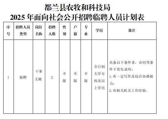 因工作需要,都兰县农牧和科技局计划面向社会公开招聘2名临聘人员,现将有关事项公告如下:
