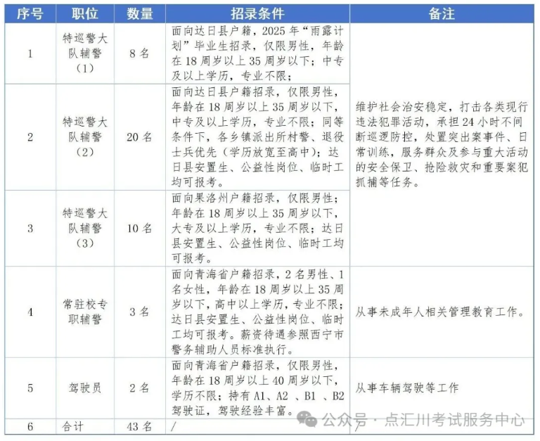 4.资格复审合格人员名单及体能测试通知将在达日县人力资源和社会保障局、达日县公安局公众号、点汇川考试服务中心微信公众号公示,公示期为3天。