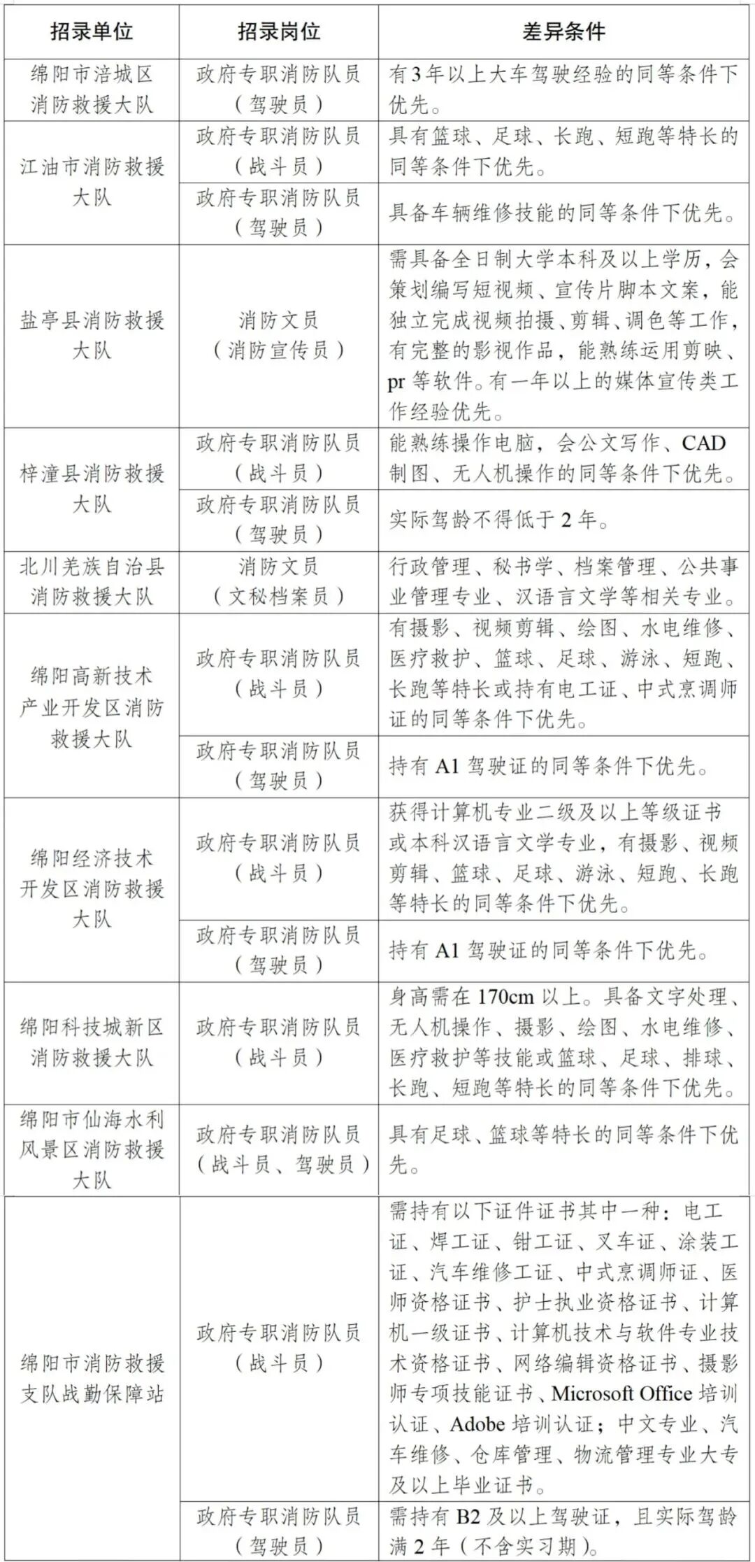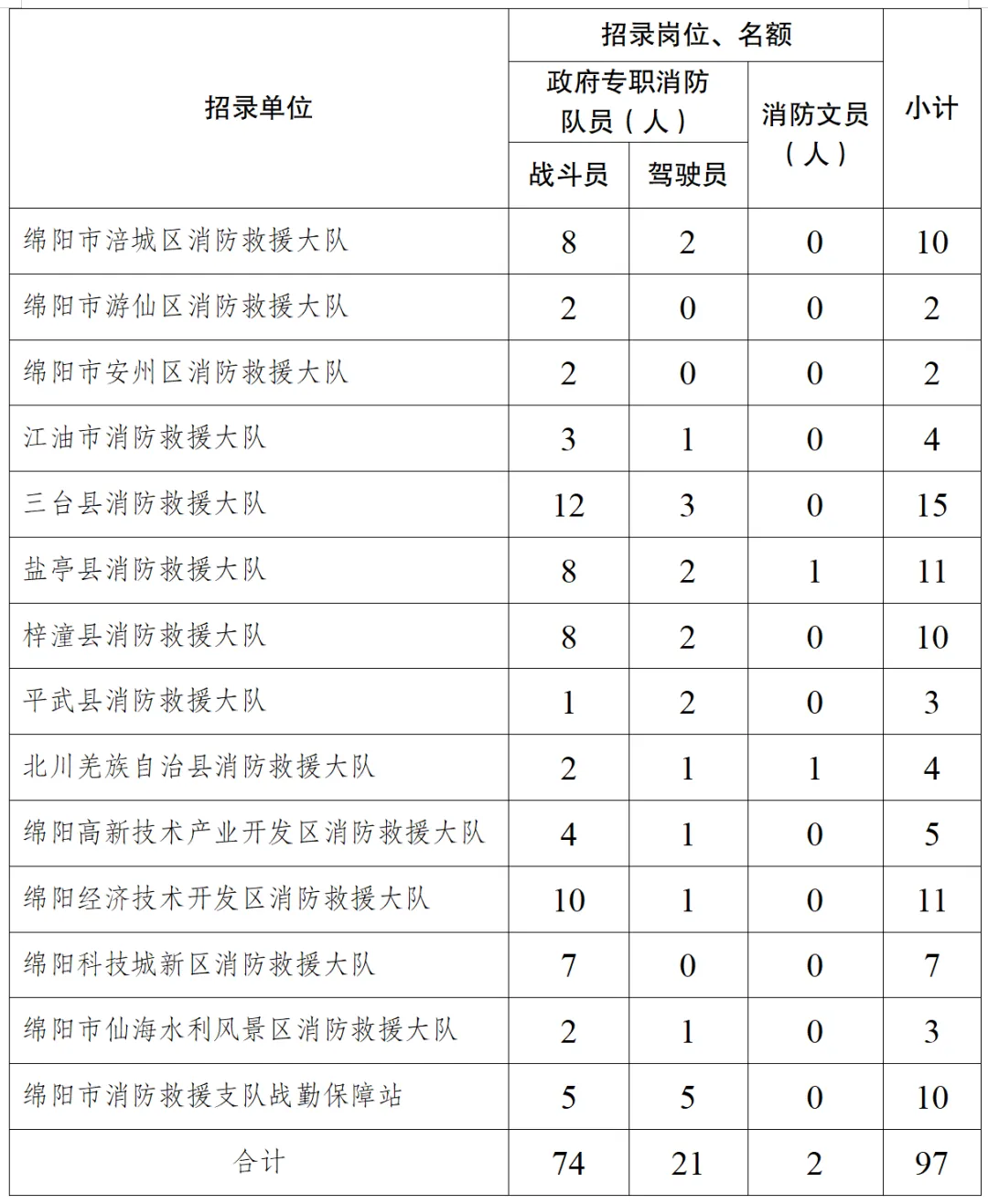 根据工作需要,经绵阳市消防救援支队研究,决定面向社会公开招录97名合同制政府专职消防员。现将有关事宜公告如下: