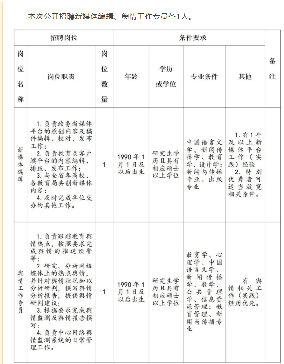 本次公开招聘新媒体编辑、舆情工作专员各1人。
