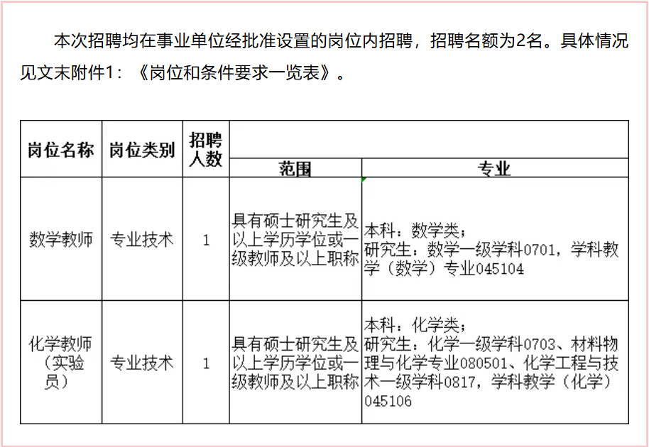 本次招聘均在事业单位经批准设置的岗位内招聘,招聘名额为2名。具体情况见文末附件1:《岗位和条件要求一览表》。