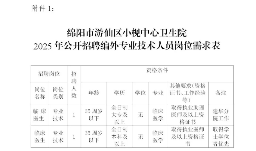 本次共招聘2名。具体岗位、岗位人数及专业条件等详见附件《绵阳市游仙区小枧中心卫生院2025年公开招聘编外专业技术人员岗位表》(以下简称《岗位表》)。
