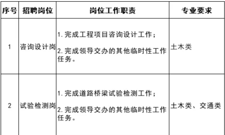 本次招聘咨询设计岗、试验检测岗2类岗位,实际录用人数由公司根据应聘人员数量、综合素质、岗位需求等情况综合研判后统筹调剂录用。