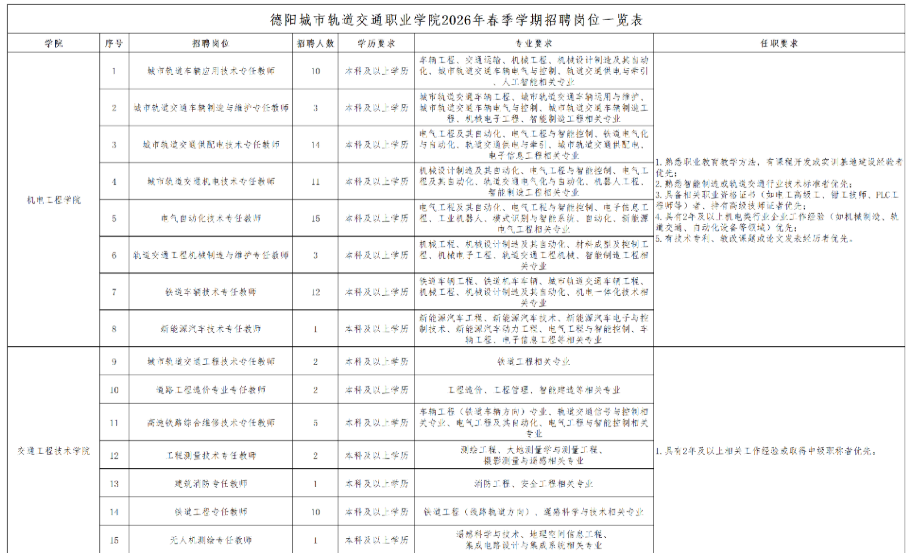 (5)具备本公告具体招聘岗位要求的条件和资格详见《德阳城市轨道交通职业学院2026年春季学期招聘岗位一览表》(见附件1)。