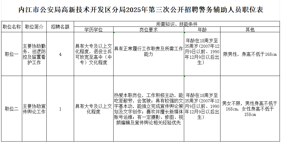 根据工作需要,按照《四川省警务辅助人员管理办法》《内江市公安机关警务辅助人员使用管理办法》《内江市公安局高新技术开发区分局警务辅助人员招聘办法(试行)》等规定,遵循公开、平等、竞争、择优的原则,内江市公安局高新技术开发区分局决定面向社会招聘警务辅助人员。现将有关事项公告如下: