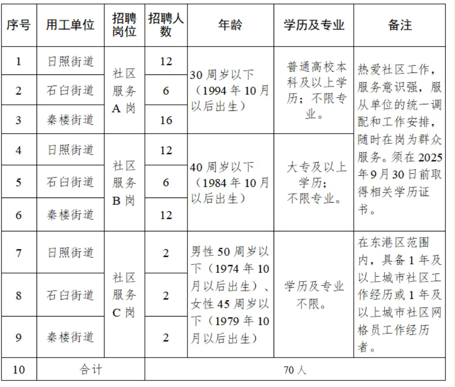 为进一步充实日照街道、石臼街道、秦楼街道社区工作人员力量,优化社区工作人员队伍结构,提升社区治理服务能力和水平,经研究决定,由山东杰出人才发展集团面向社会公开招聘70名工作人员,统一派驻到相关街道社区工作。现将有关事宜公告如下: