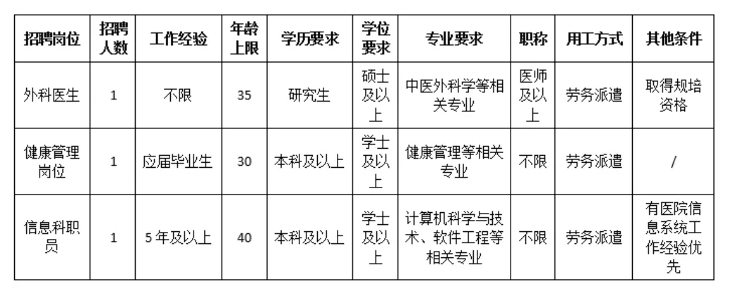 上海市嘉定区中医医院根据工作需要,现向社会公开招录外科医生1名、健康管理岗位1名、信息科职员1名,具体信息如下所示: