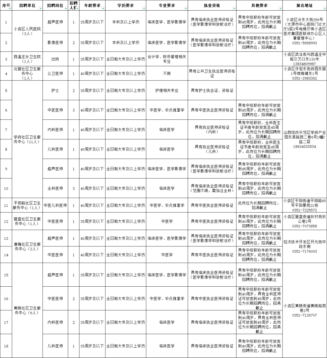 太原市小店区医疗集团于2019年1月4日正式启动,集团拥有先进的医疗设备和专业的医疗团队,致力于为患者提供优质的医疗服务。集团下属的社区卫生服务中心、乡镇卫生院是集预防、医疗、保健、健康教育、康复、计划生育指导于一体的社区卫生服务机构。为进一步加强集团医疗人才队伍建设,适应集团发展的需求,切实为人民健康提供服务和保障,根据集团不同发展需求,面向社会公开招聘。