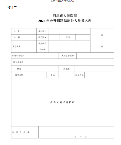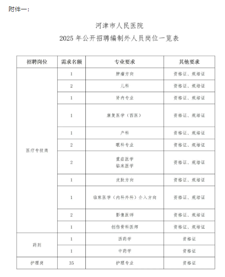(一)基本条件拥护党的路线、方针、政策、遵守国家宪法和法律法规,无违法、违纪现象,具有良好的品行和职业道德,身体健康。(二)年龄要求35周岁以下。(三)学历要求1.医疗人员:全日制本科及以上学历(有规培合格证明按研究生对待)。2.医技人员:全日制本科及以上学历。3.护理人员:全日制大专及以上学历。(四)资格要求1.医疗人员:取得执业资格证、规培证。2.医技人员:取得资格证。3.护理人员:取得注册护士资格证。四、报名方式(一)报名时间及地点报名时间:2025年11月27日--11月28日(周四、周五),上午8:00-12:00,下午14:30-18:00。报名地点:河津市人民医院门诊大厅。(二)报名携带材料报名时必须携带以下材料:1.二代身份证原件及复印件;2.毕业证(学位证)原件及复印件;3.学信网学历证书电子注册备案表;4.相应资格证书原件及复印件;5.近期免冠1寸红底彩色照片2张,报名时填写报名表。五、考试方式考试采取笔试和面试相结合的形式,均采取百分制。综合成绩=笔试成绩×60%+面试成绩×40%(研究生直接予以面试。采取直接面试考核形式的岗位,面试成绩即为综合成绩)。笔试、面试和综合成绩均按四舍五入法,保留小数后2位数,依据综合成绩从高到低依次录取。(一)笔试笔试采取闭卷方式进行,总分为100分。(二)面试结合专业要求,对考生进行综合素质测评,主要测试应聘者的专业知识及思维理解、分析应变、语言表达、解决实际问题等能力。考生面试顺序临时抽签决定,面试满分为100分。六、体检考试合格者,将进行体检,体检参照《公务员录用体检通用标准(试行)》执行,体检费用由应聘者负担,体检不合格者,取消录用资格。七、公示根据考试、体检结果确定拟录人选,上报院长办公会、党总支会审议通过,在院内院务公开栏进行公示,公示时间为5个工作日。八、聘用1.公示无异议的拟聘人员,于规定时间至河津市人民医院人事科(行政楼3007)办理入职手续。2.录用的人员将进行为期一周的岗前教育。培训后进行考核,若第一次考核不合格,给一次补考机会,补考不合格者,取消录用资格。3.实行试用期制度,试用期为六个月,试用期间执行试用工资、出勤奖;试用期满,按医院《聘用制人员管理办法》执行相应待遇。4.试用期满,由所试用的科室和职能部门签定考评意见,考核合格者,签订院内聘用合同,予以正式聘用;考核不合格者,不予聘用。5.聘用人员一经录用,要服从院方统一管理,统一调配,否则取消聘用资格。附件:1.河津市人民医院2025年公开招聘编制外人员岗位一览表2.河津市人民医院