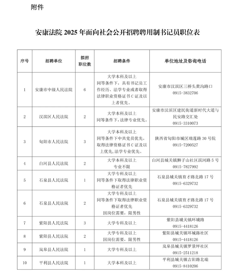 安康法院共招聘聘用制书记员23名,各法院招聘职位、条件、地址及政策咨询电话详见《安康法院2025年面向社会公开招聘聘用制书记员职位表》(附件)。