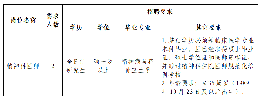 因医院工作需要,面向社会公开招聘精神科医师2名。现就有关事项公告如下: