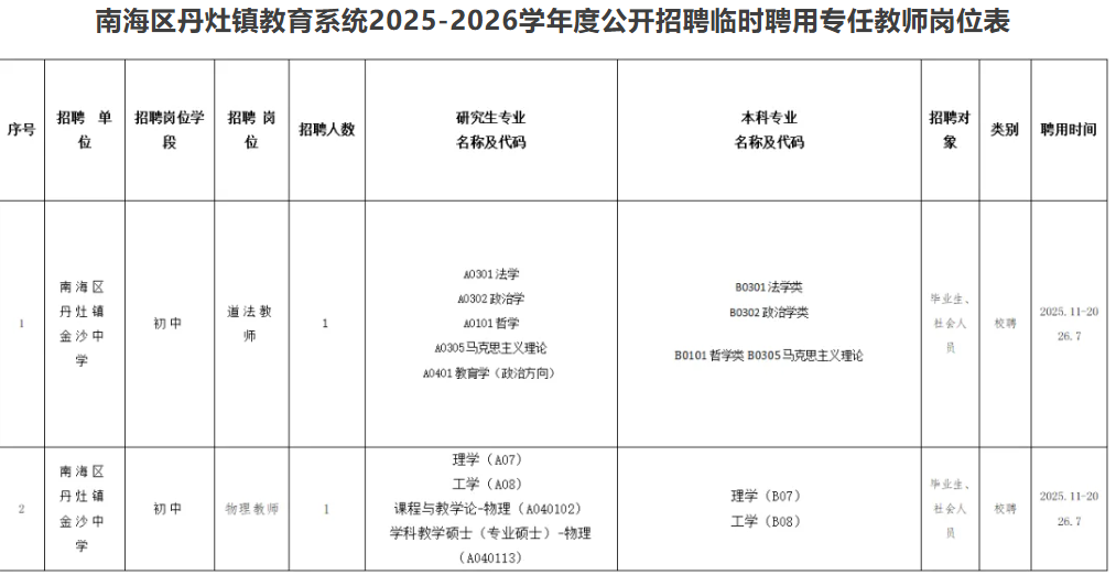 本次计划公开招聘短期代课教师2名,招聘岗位有:道法1名、物理1名。招聘对象分为应届毕业生和社会人员两类,各岗位招聘对象要求详见《丹灶镇2025-2026学年临聘教师招聘计划和岗位表》(附件1)。具体招聘对象如下: