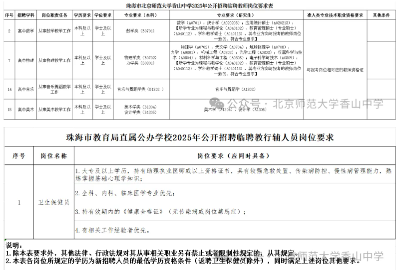 为深入贯彻落实“百万英才汇南粤”行动计划,加强教师队伍建设,着力推进珠海市教育高质量发展,进一步规范市教育局直属公办学校临聘教师管理工作,根据《珠海市教育局直属学校临聘教职员管理办法(试行)》等相关文件精神,现将我校2025年10月招聘临聘教师及临聘教辅人员有关事项公告如下:
