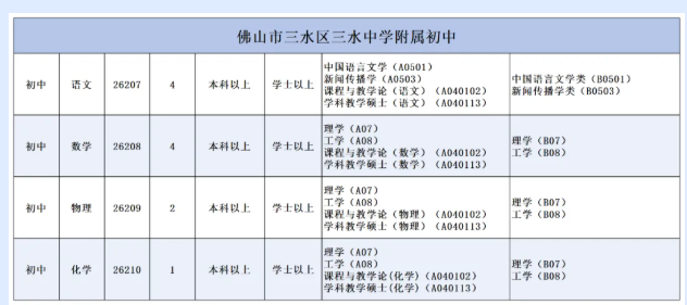 根据工作需要,三水中学附属初中面向2026年高校应届毕业生招聘教师11名,本场招聘在广州设点,其中,语文教师4名,数学教师4名,物理教师2名,化学教师1名。获聘人员为事业单位编制工作人员,聘为专业技术岗位12级以上,主要从事学科教学及教育管理工作,享受国家政策规定的薪酬待遇。
