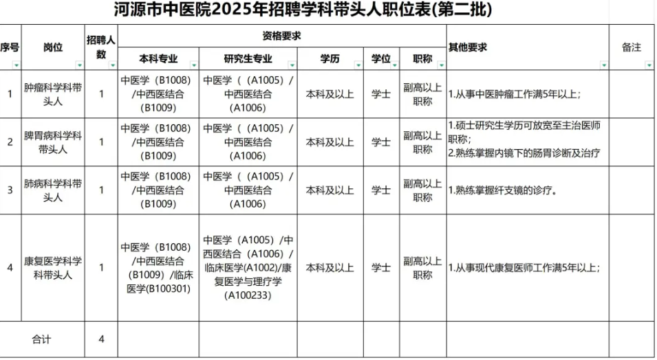 本次计划招聘4人。招聘岗位名称、岗位职责和资格条件要求详见《河源市中医院2025年招聘学科带头人(第二批)职位表》(附件1)。