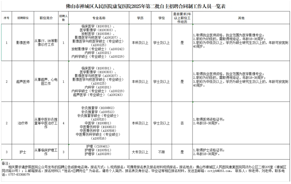 详见附件:1.《佛山市禅城区人民医院康复医院2025年自主招聘第二批合同制工作人员一览表》。