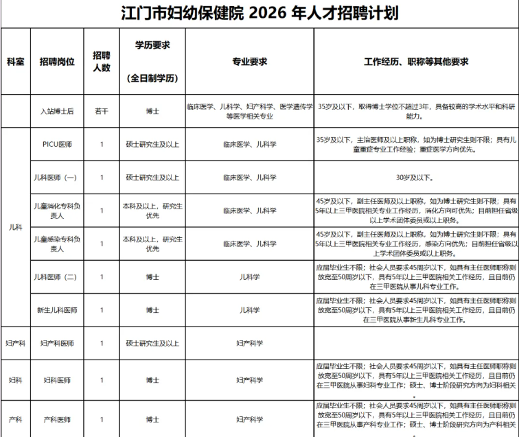 请登入江门市妇幼保健院官网(http://www.jmfy3861.com),通过【院务公开】进入【招聘系统】入口,注册并投递简历,每人限投一个岗位,以上岗位招满即止。