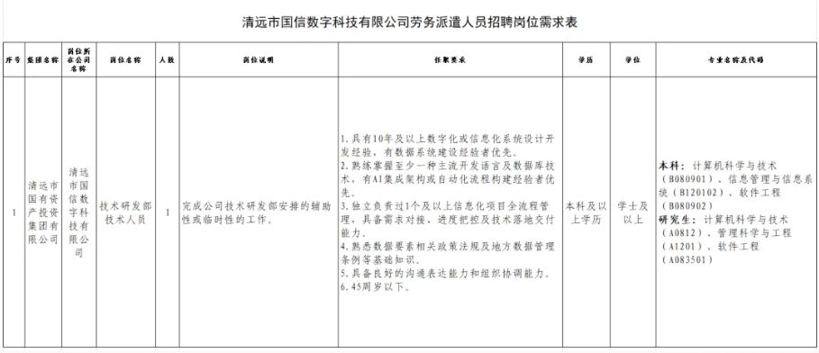 详见附件1:清远市国信数字科技有限公司劳务派遣人员招聘岗位需求表
