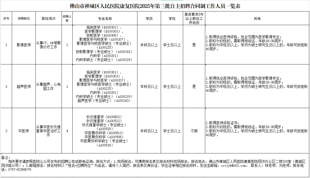 详见附件:1.《佛山市禅城区人民医院康复医院2025年自主招聘第三批合同制工作人员一览表》。
