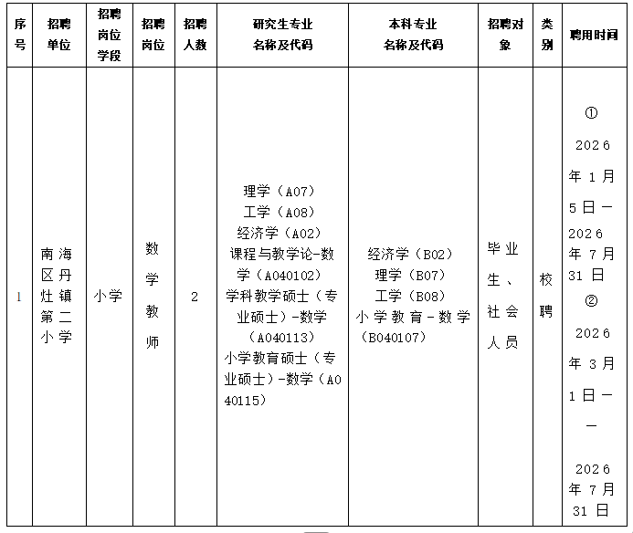 本场招聘短期临聘教师2名。详见《南海区丹灶镇教育系统2025-2026学年面向社会公开招聘短期临聘教师计划和岗位表》(附件1)。