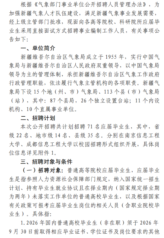 新疆维吾尔自治区气象局2026年度事业单位公开招聘应届毕业生公告(第一批)