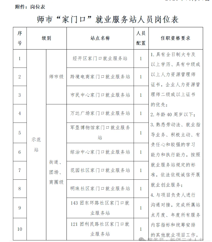 本次共招聘“家门口”就业服务站工作人员10名,覆盖师市级示范站及街道、团场、商圈级示范站。(详见附件:岗位表)