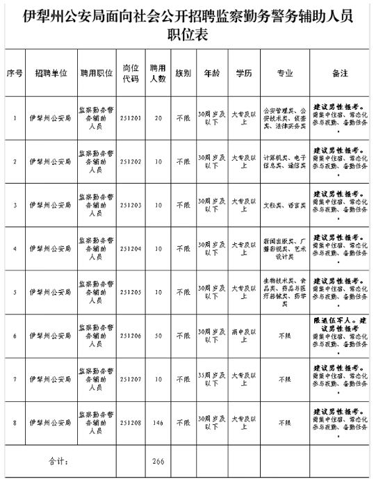 根据《中华人民共和国监察法》《新疆维吾尔自治区公安机关警务辅助人员招聘办法》等相关规定,新疆伊犁州公安局现面向社会公开招聘266名警务辅助人员,主要负责监察勤务工作。现就有关事项公告如下: