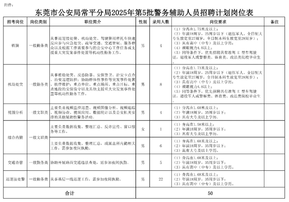 本次招聘共设置6个岗位,计划招聘50人,具体招聘岗位、人数、资格条件等详见《东莞市公安局常平分局2025年第5批警务辅助人员招聘计划岗位表》(附件)。