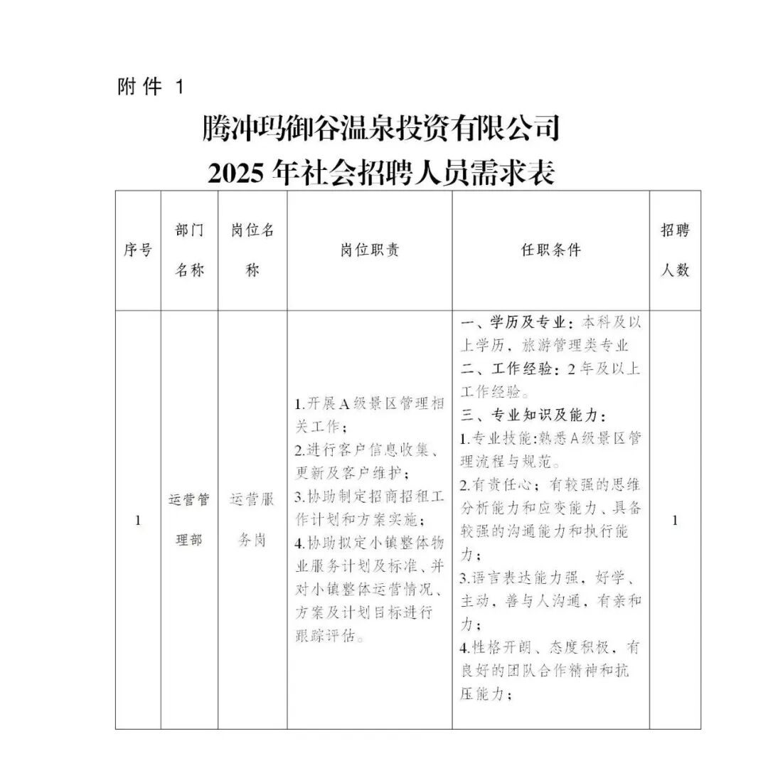 附件1:腾冲玛御谷温泉投资有限公司2025年社会招聘人员需求表