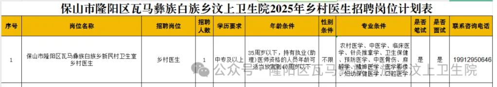 本次共招录乡村医生1人,详见附件《保山市隆阳区瓦马彝族白族乡汶上卫生院2025年乡村医生招聘岗位计划表》。