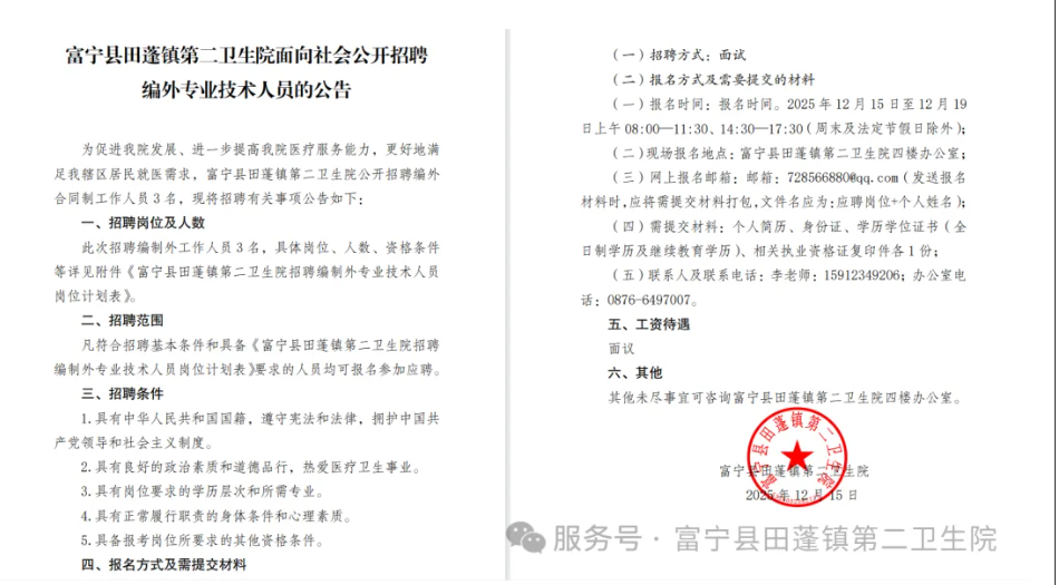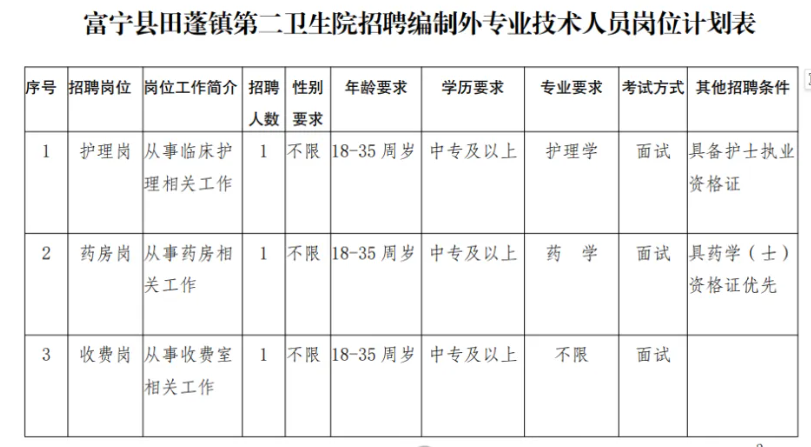 此次招聘编制外工作人员3名,具体岗位、人数、资格条件等详见附件《富宁县田蓬镇第二卫生院招聘编制外专业技术人员岗位计划表》。