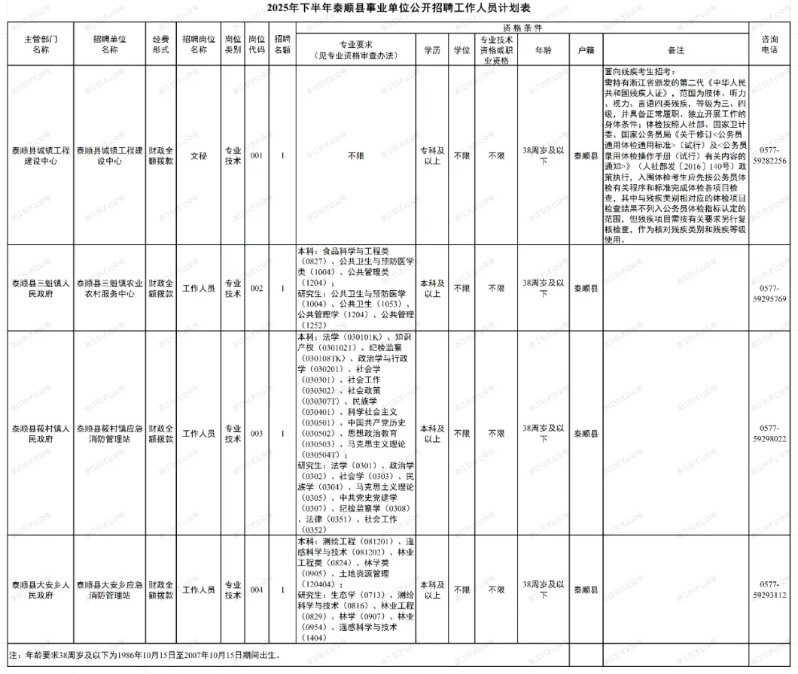 本次公开招聘事业单位工作人员4名。具体招聘单位、招聘岗位、招聘人数和岗位条件要求详见《2025年下半年泰顺县事业单位公开招聘工作人员计划一览表》(附件1)。