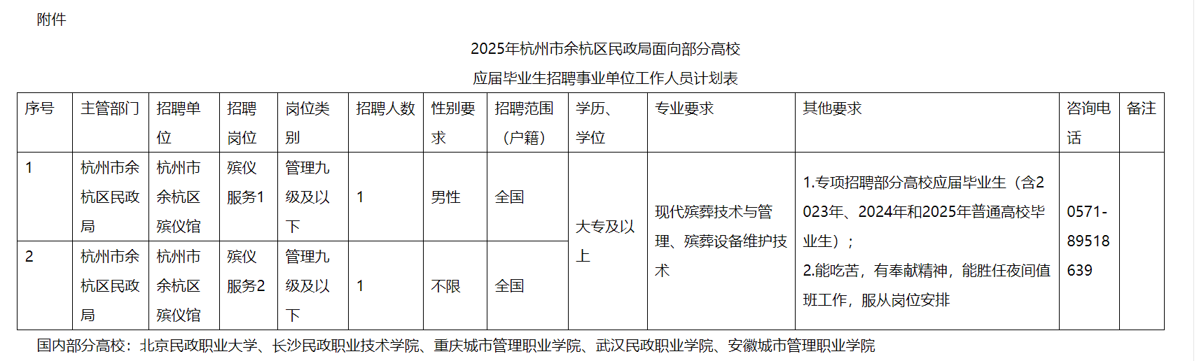 本次计划招聘事业单位工作人员2名。具体招聘单位、岗位、面向高校、专业、人数和报考条件等详见《2025年杭州市余杭区民政局面向部分高校应届毕业生招聘事业单位工作人员计划表》(附件)。